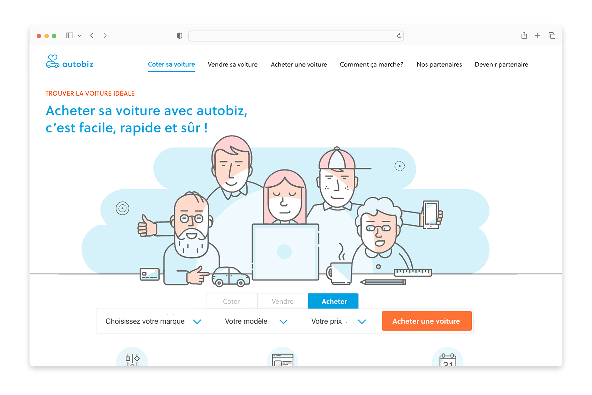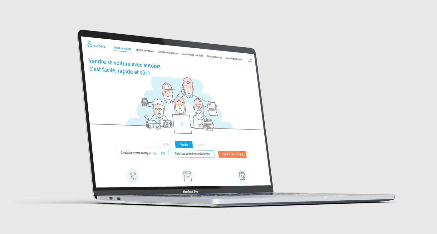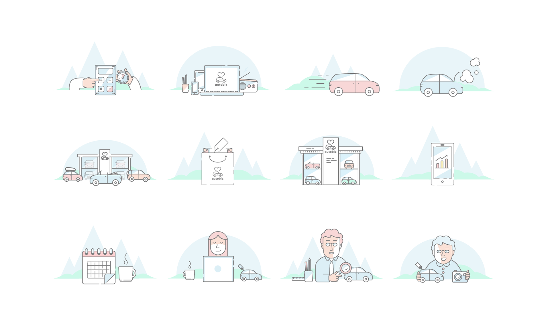 A series of custom vector illustrations was developed to differentiate Autobiz from competitors often relying on generic automotive imagery.