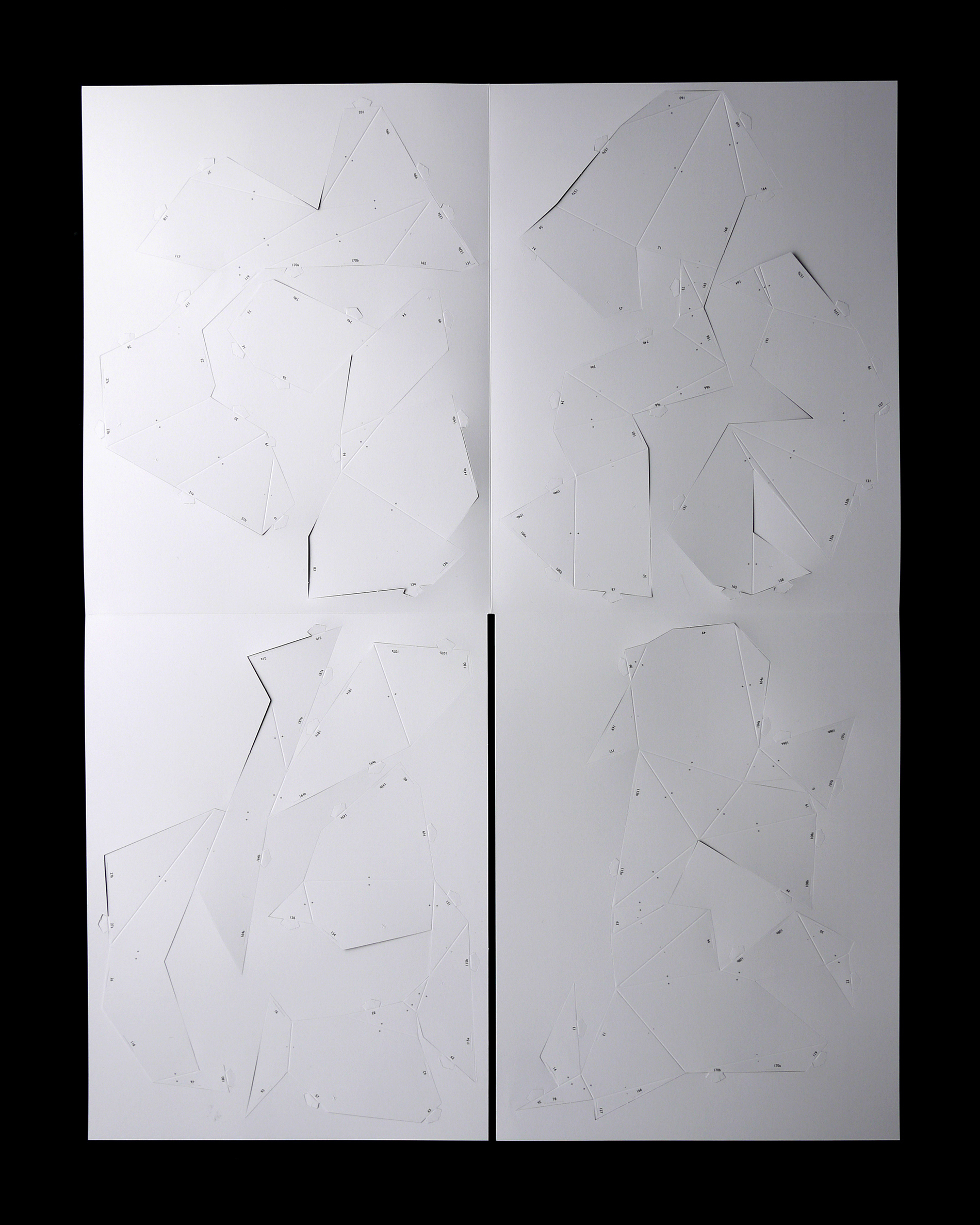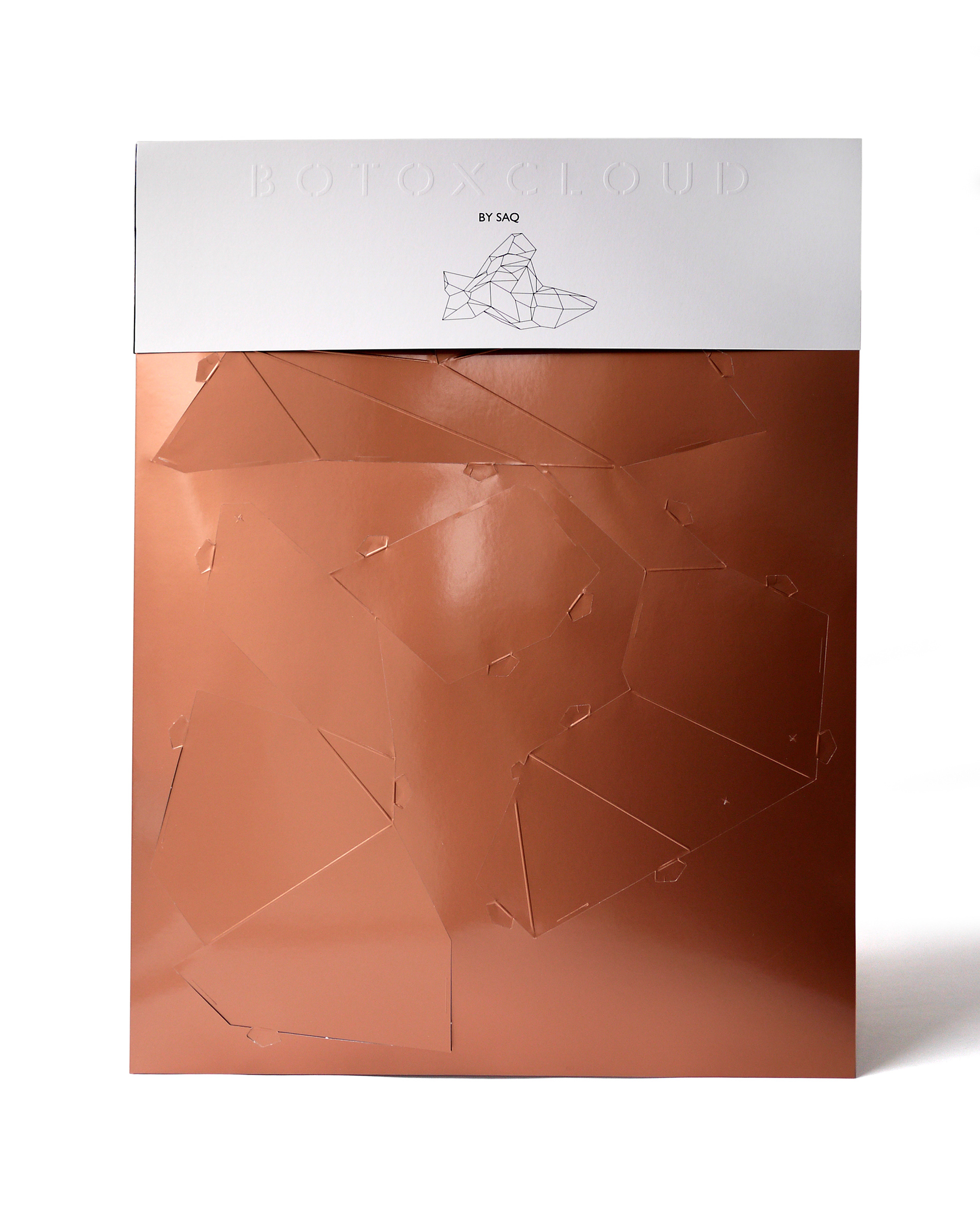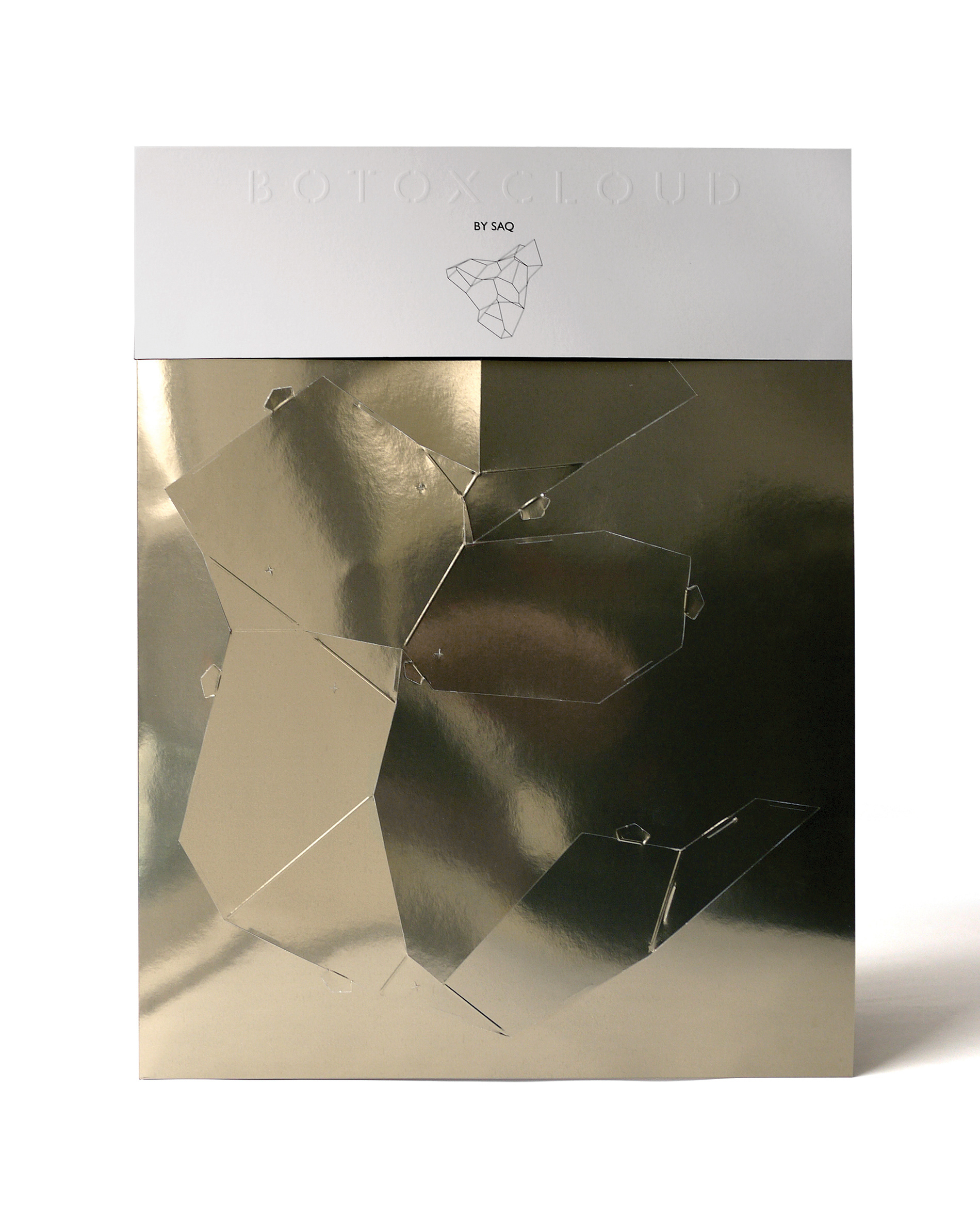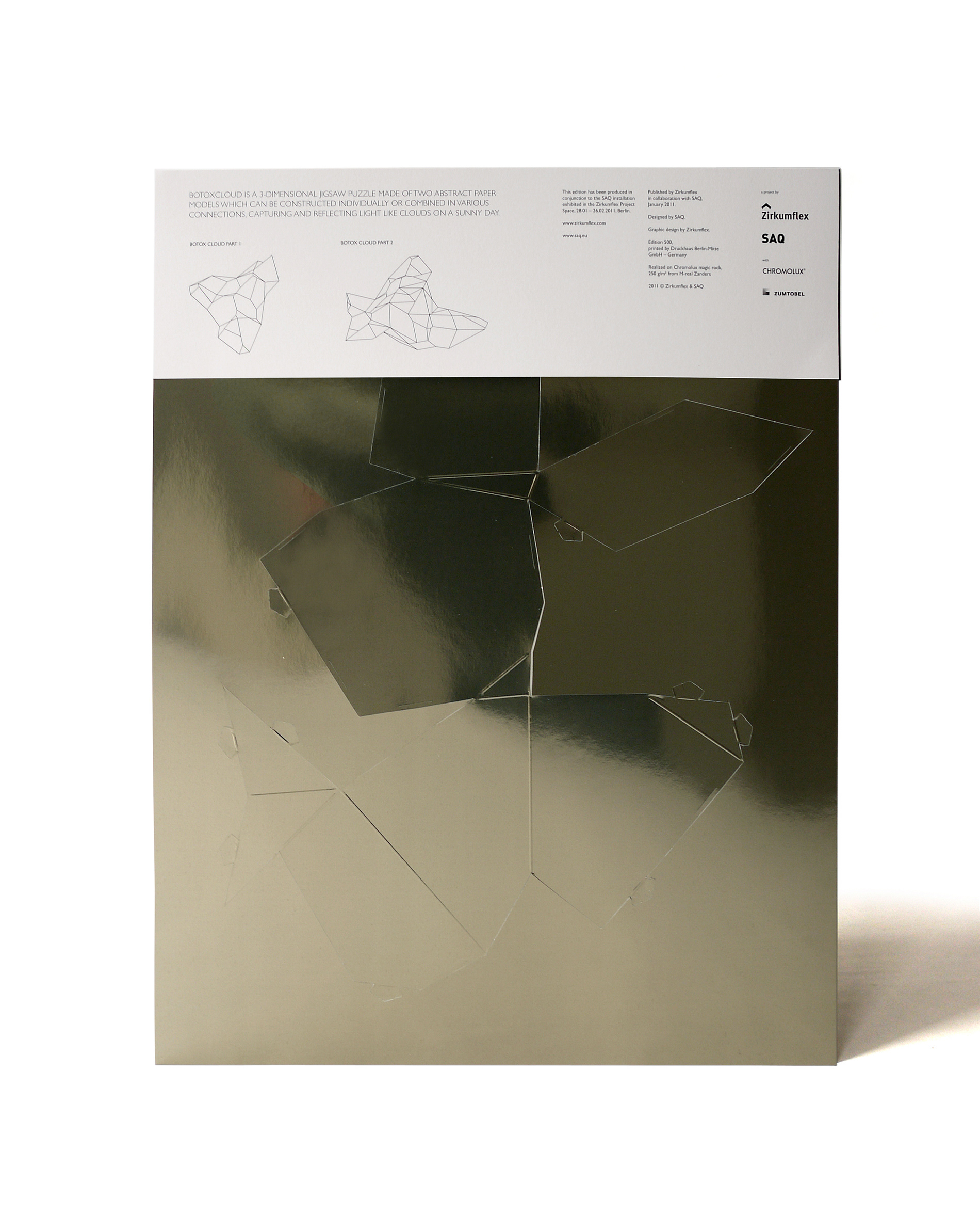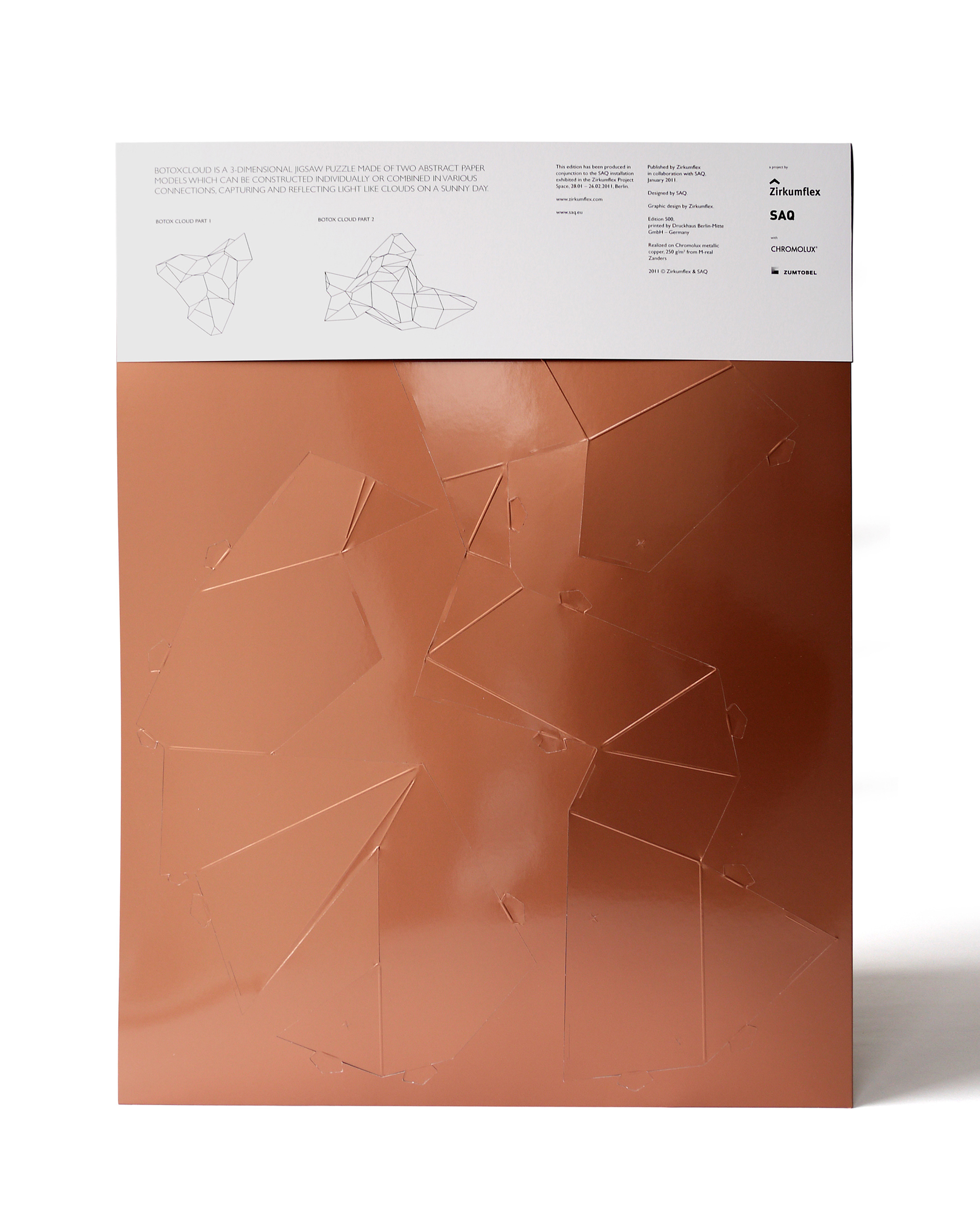 For the BotoxCloud project, which we created in collaboration with designer Brice Delarue and the SAQ studio for Zirkumflex, we sought to explore how editorial design can extend a spatial and conceptual installation. We designed a printed piece conceived as an object to be handled: two abstract models to cut, fold, and assemble, transforming the flat surface into volume. The generous format (67 × 97 cm open) and Chromolux 250 g/m² paper allowed us to work with the tension between gloss, rigidity, and precision. The finishing details — die-cutting, embossing, and lamination — physically translate the idea of “inflation” and transformation embedded in the name BotoxCloud. Produced in a limited edition of 500 copies, this publication bridges graphic design, architecture, and the printed object. It invites the reader to become an active participant — to construct the piece and experience the dialogue between surface and volume. Through this project, we wanted to show how layout, material, and gesture can turn editorial design into a truly three-dimensional space.