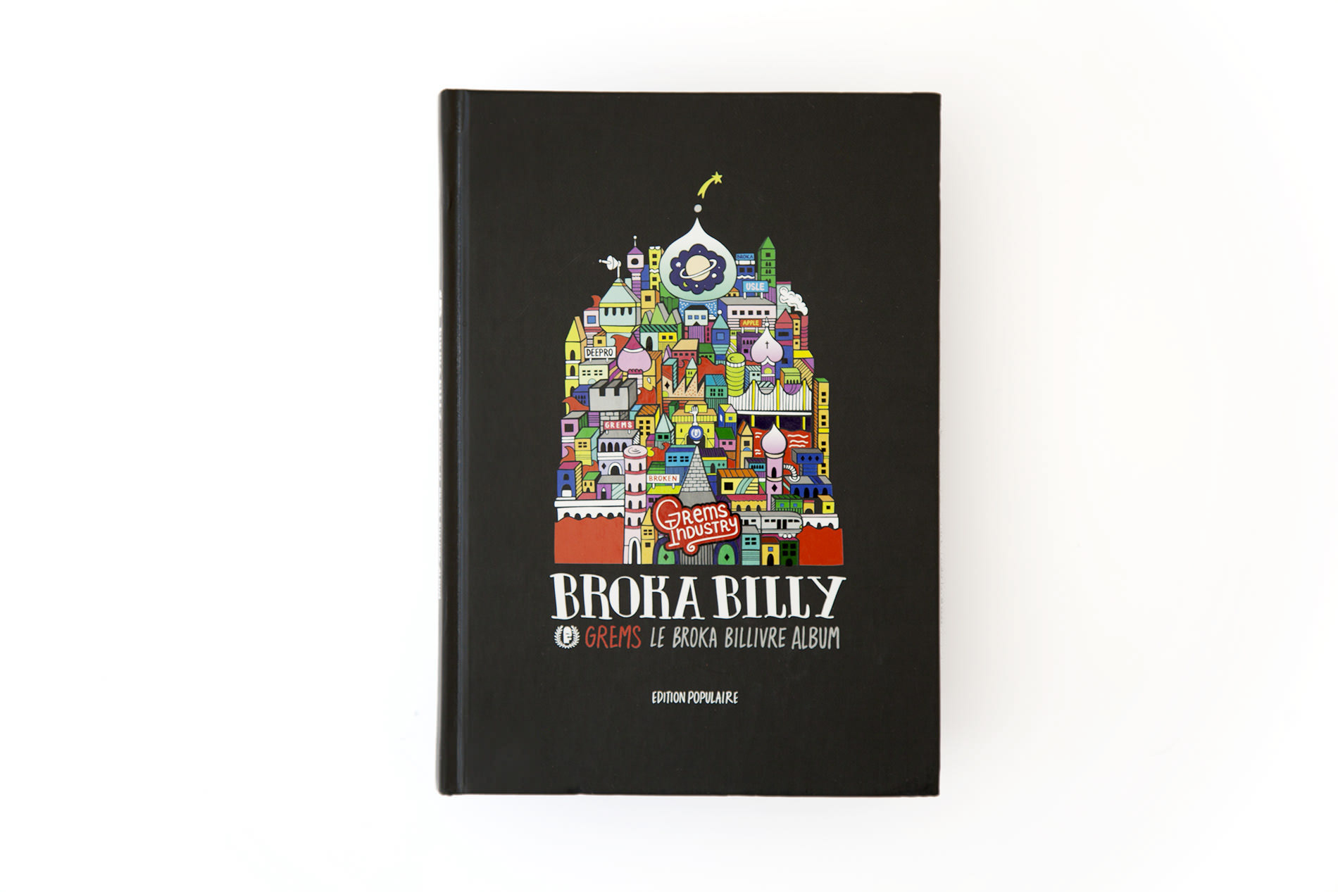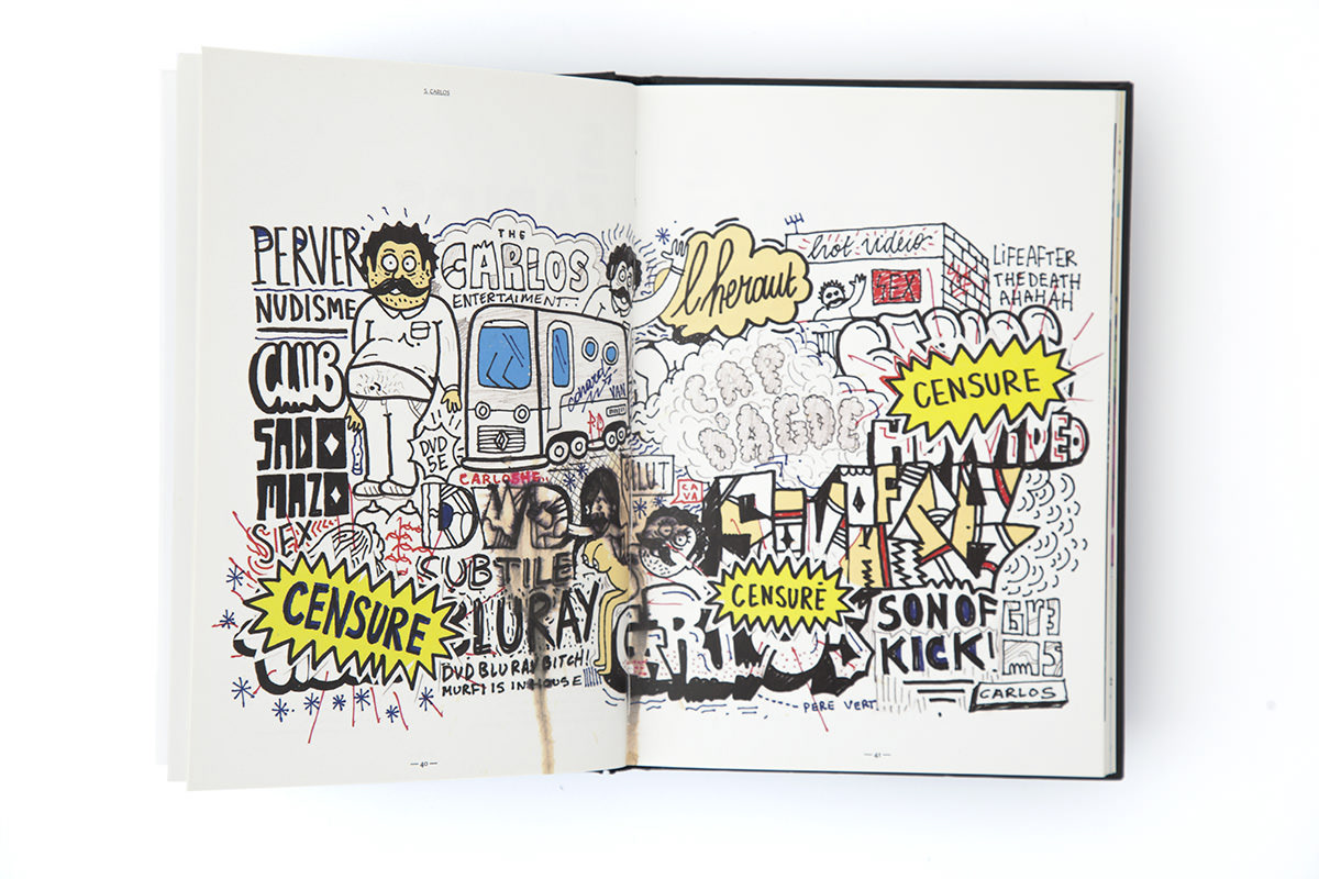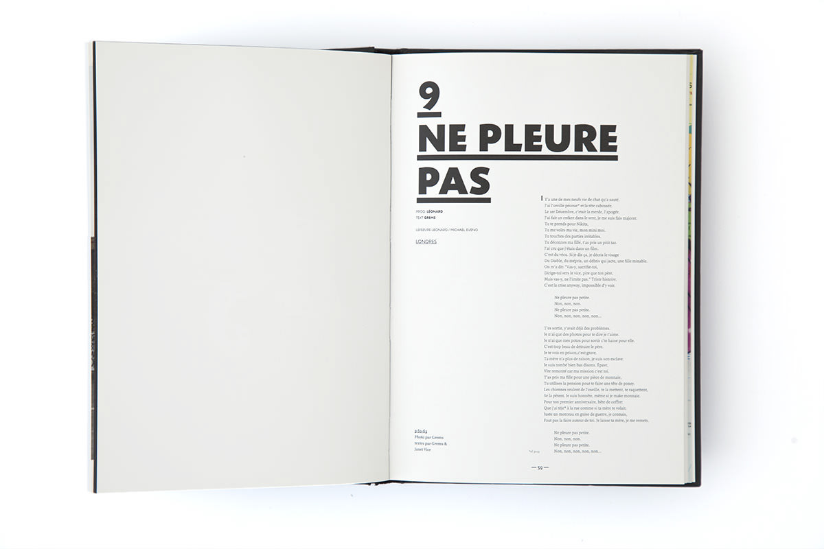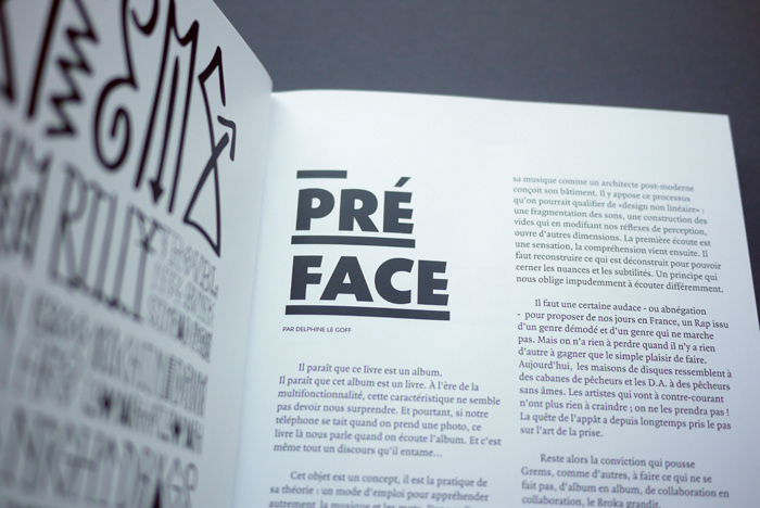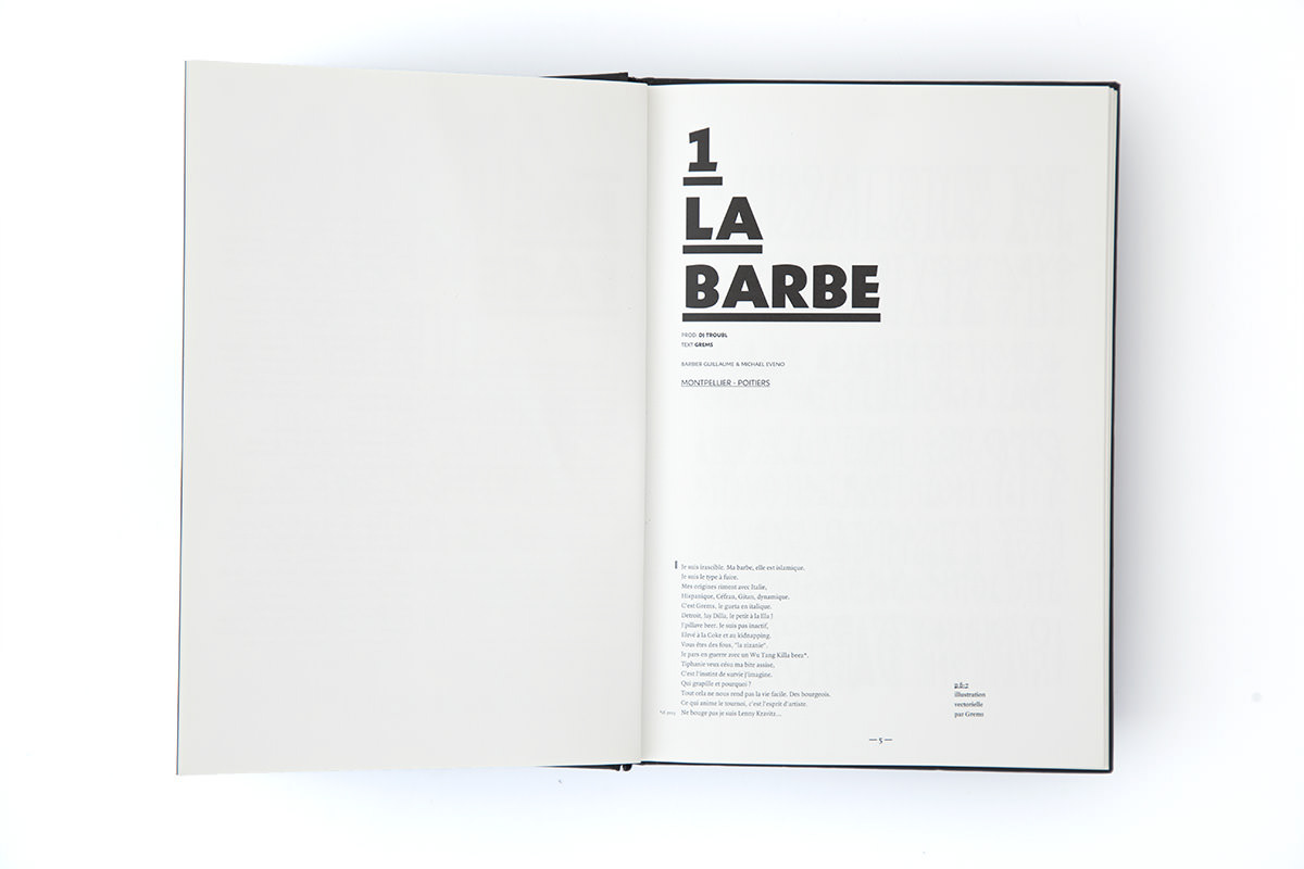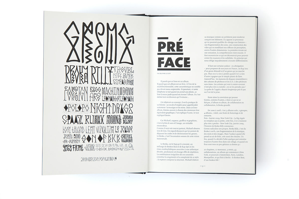 For the Broka Billy edition, created in collaboration with Brice Delarue for Zirkumflex, we designed a hybrid printed object — a book + CD, 128 pages + audio, in a 15.3 × 21.5 cm format. Each chapter corresponds to a track from Grems’ album, translating sound into a visual narrative through a mix of illustration, photography, typography, and performance. The editorial concept was to merge the visual and the sonic, turning paper into a continuation of the music. The 17 chapters for 17 tracks provided the rhythmic structure for a layout that alternates between intensity and pause. Our work on materiality — image layering, rough textures, bold typography — aimed to make the physical object resonate with the raw energy of broken beat. Through this edition, we explored how graphic design can connect a musical universe to a tactile, printed experience. For us, Broka Billy stands as a reminder that publishing is not just about representation, but about creating an experiential object, at the crossroads of music, design, and print.