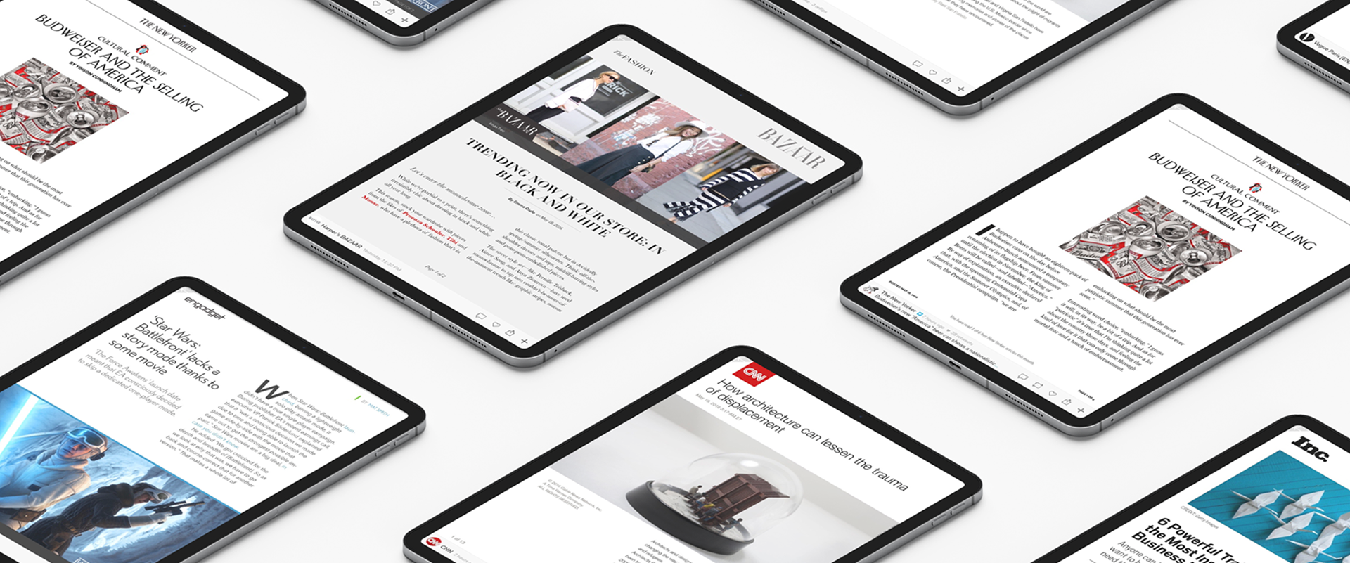 Architectural Digest, Ars Technica, BuzzFeed, CBS News, Chicago Tribune, CNET, CNN, Condé Nast, Elle, Fast Company, Financial Times, GQ, Inc., Mashable, The New Yorker, Paris Match, Quartz, Rolex, Time Magazine, Vice Magazine, Vogue, Vox Media, The Wall Street Journal, and The Washington Post.