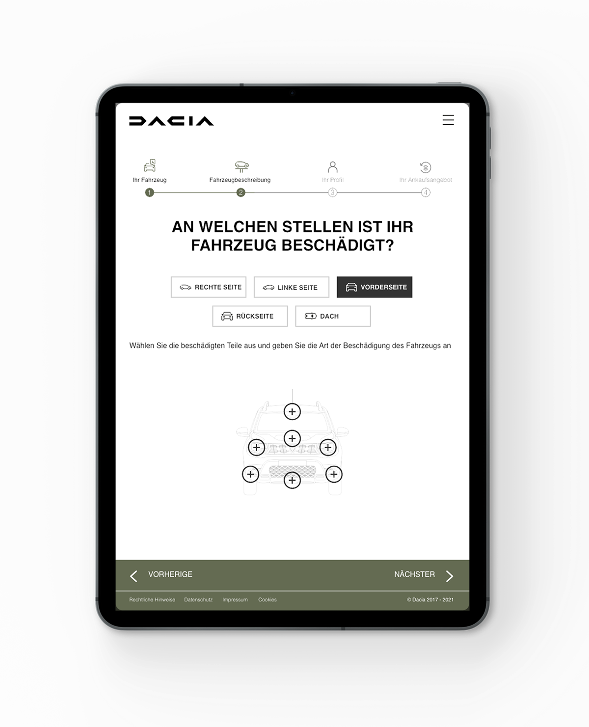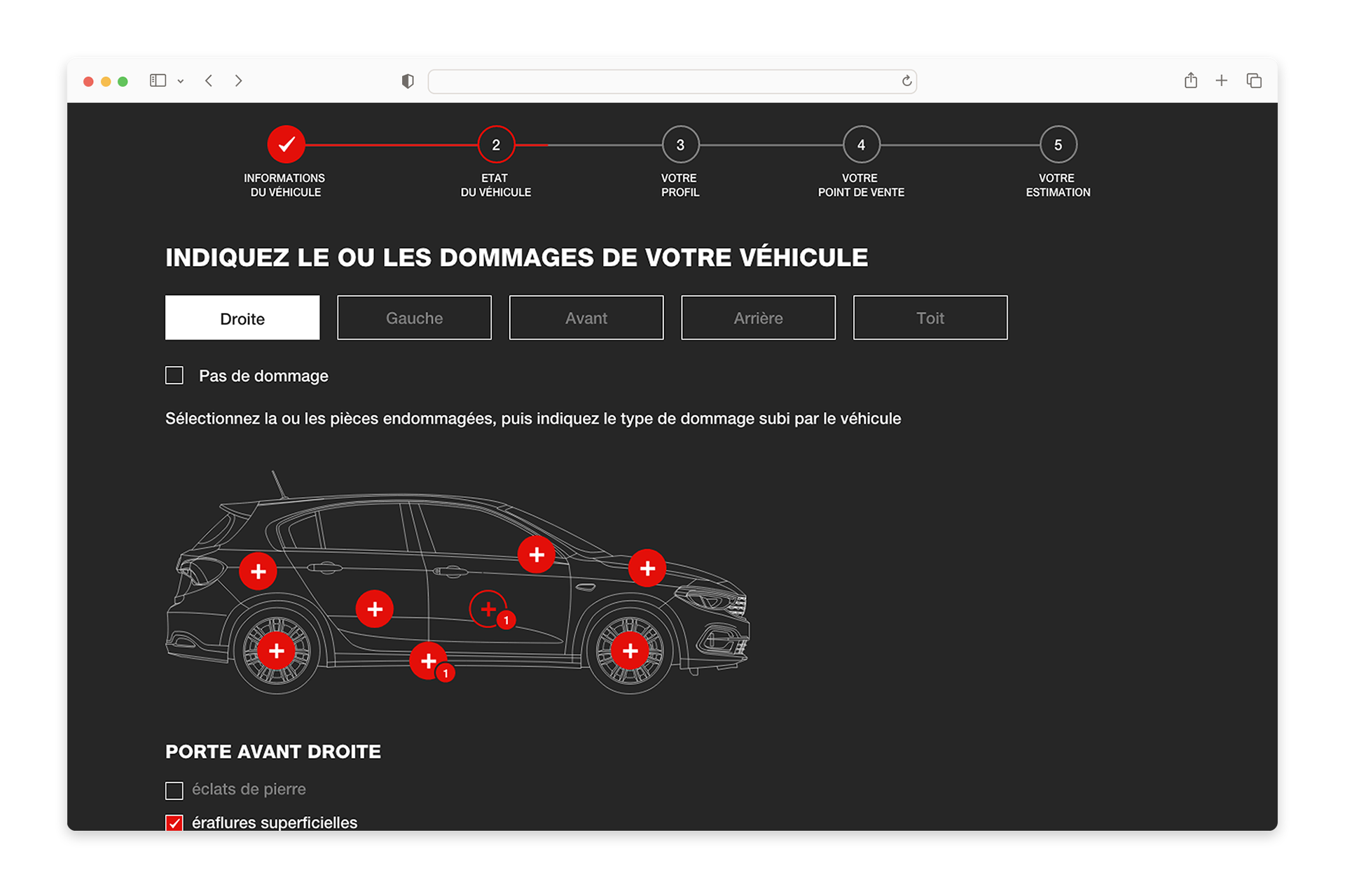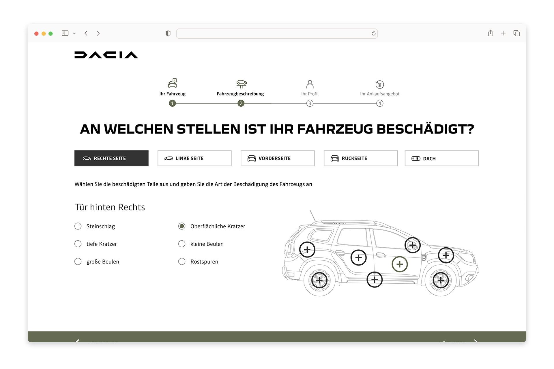 Instead of relying on traditional form inputs, the interface uses an interactive vehicle illustration where users can directly select damaged areas.