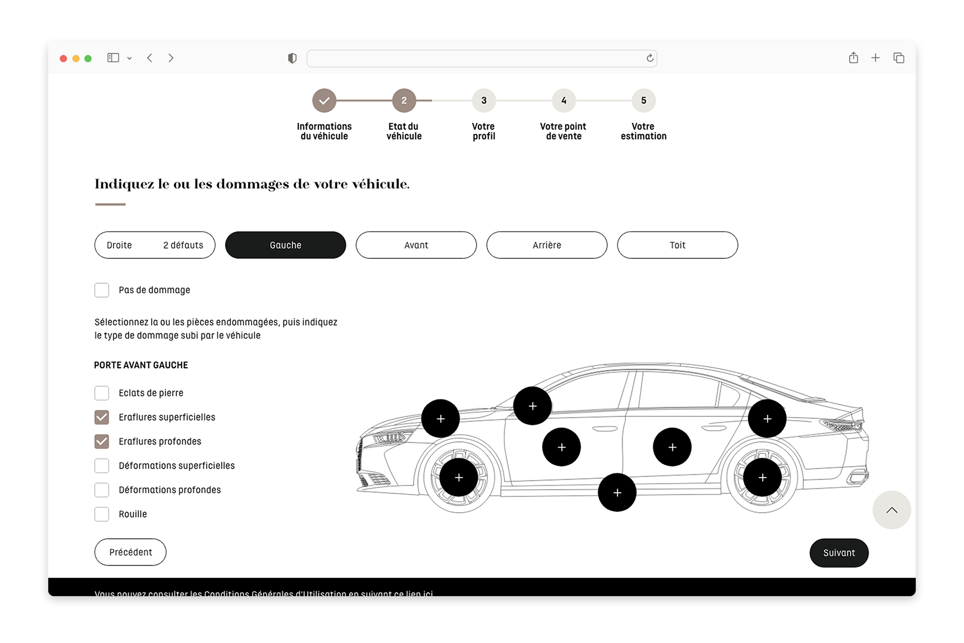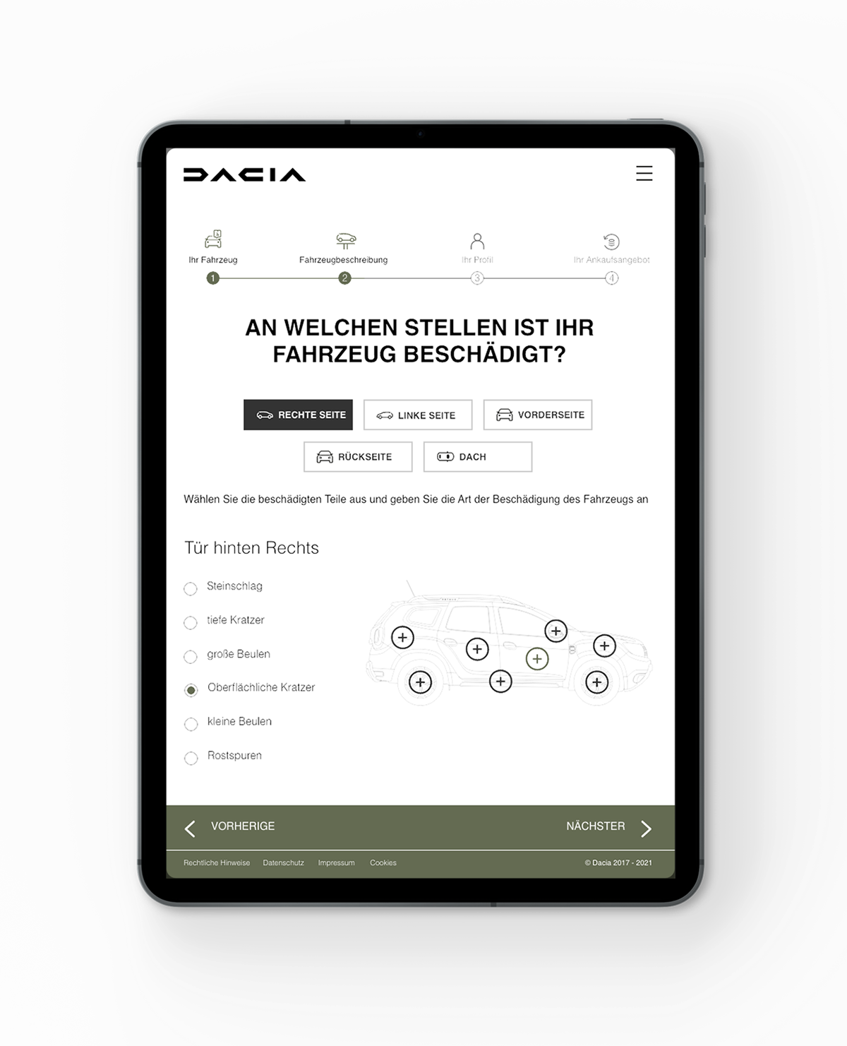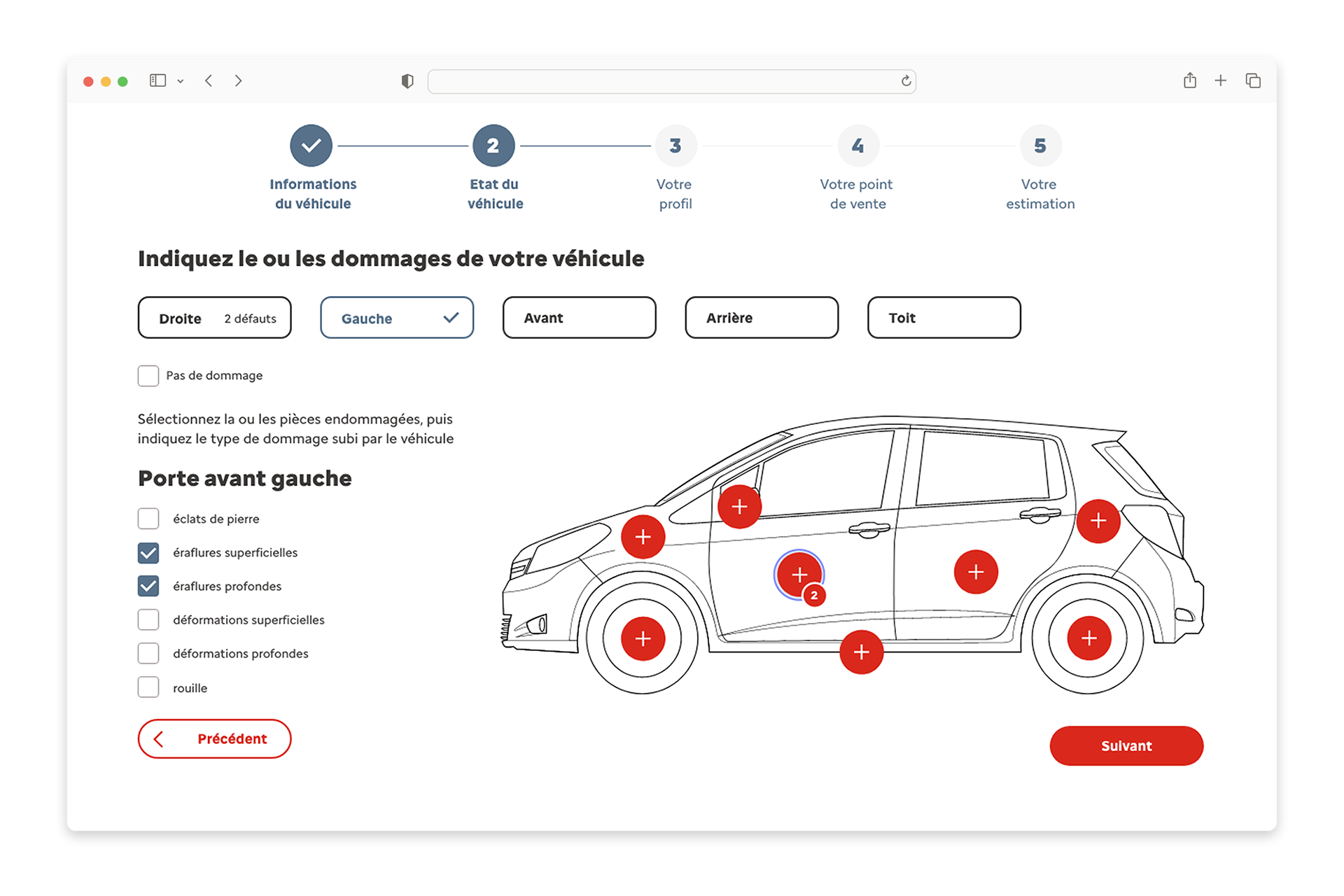 Instead of relying on traditional form inputs, the interface uses an interactive vehicle illustration where users can directly select damaged areas.