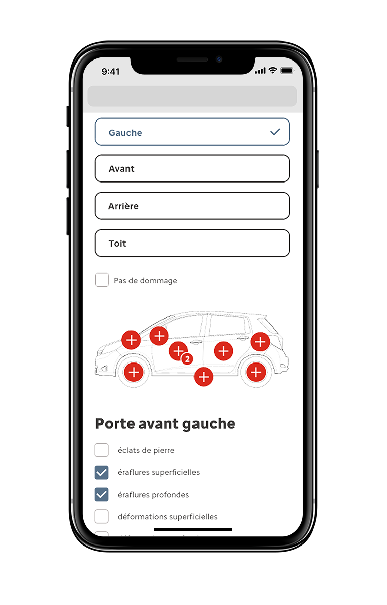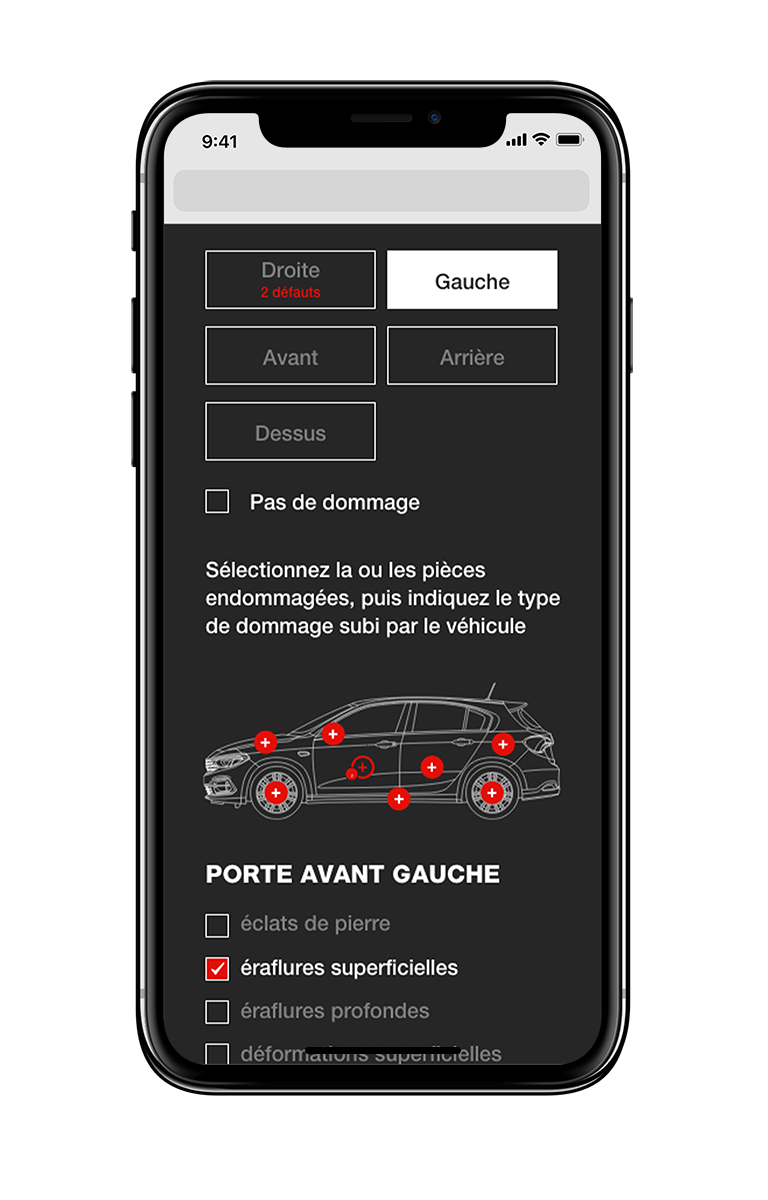 The system allows users to: identify damaged areas on the vehicle • specify the type of damage • quickly complete the assessment.